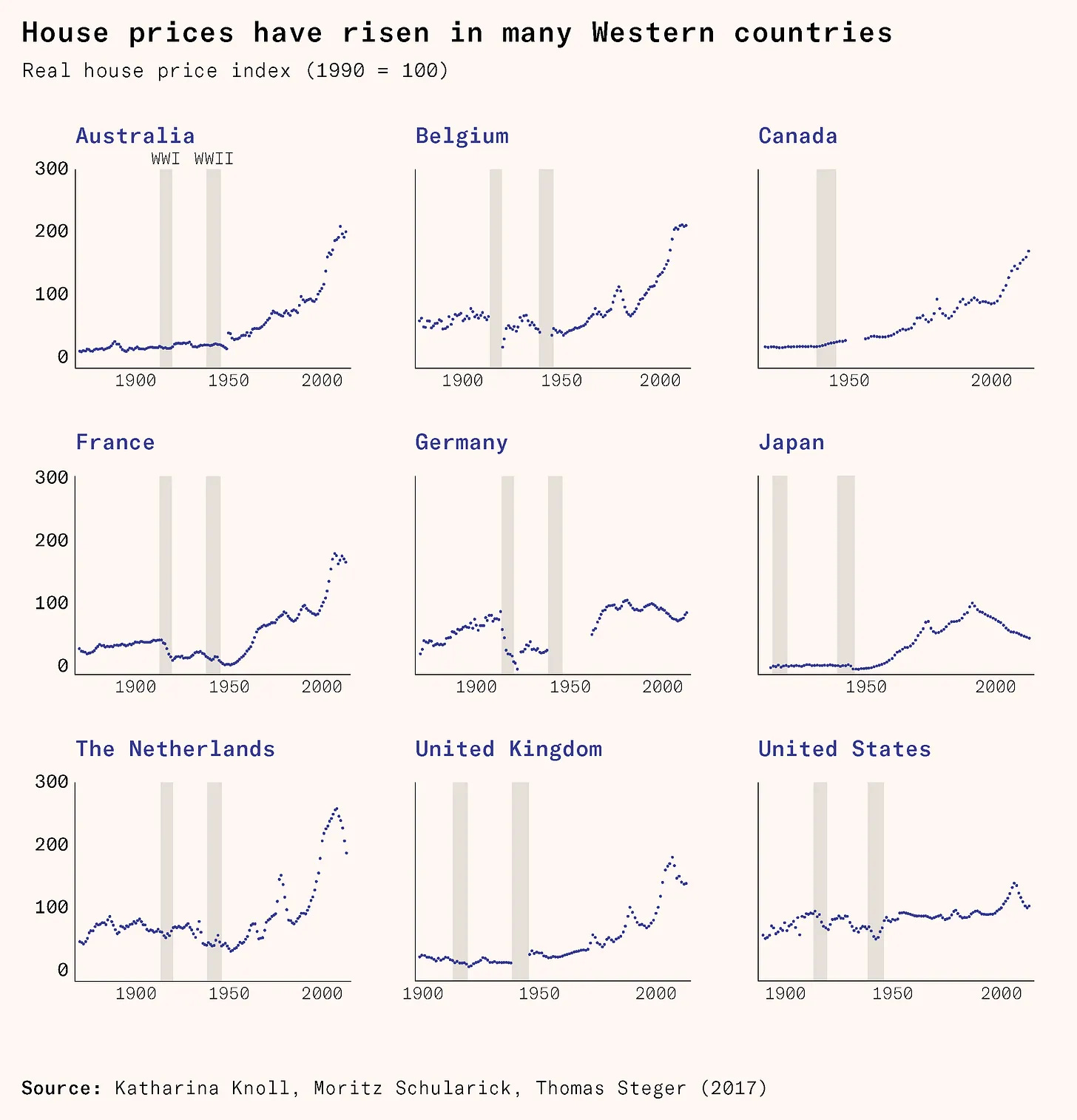 This is roughly how the housing systems of the 19th century worked. As demand rose, housing supply would rise with it. Cities did good work at enabling this through public works. As demand rose, prices rose with them. And as bodies sweat when too hot, housing markets began to churn out supply where the prices were highest. Consequently, house prices during this period were relatively flat and price per square metre actually fell, despite rising incomes (see, for example, this graph via Samuel Hughes):