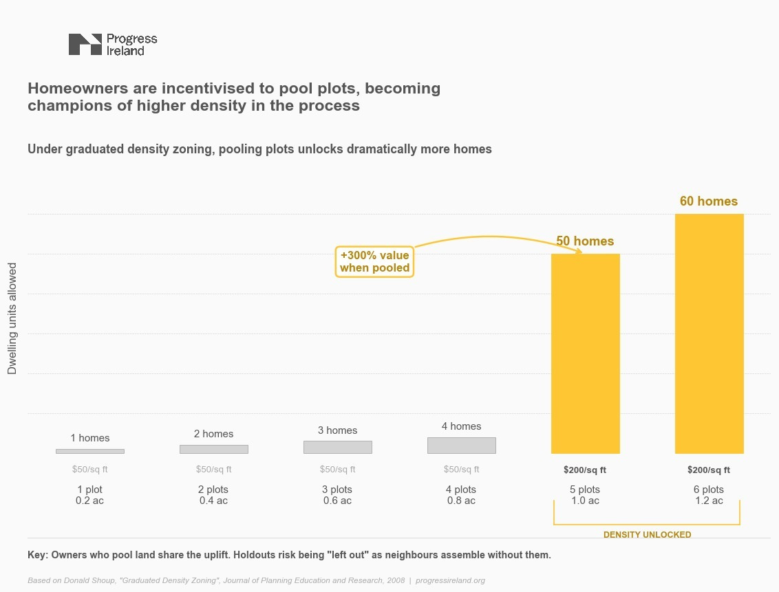 In Simi Valley, California, the city introduced a rule that allowed more homes to be built but only on larger assembled sites. On smaller sites, homeowners were stuck with low density. But when they teamed up with their neighbours and sold them together, the rules allowed them to build more together than they otherwise would be allowed to. That higher density increased the land value. And, as a result, gave homeowners a strong incentive to coordinate and sell together. This process is called graduated zoning and was created by the legendary economist, Donald Shoup.