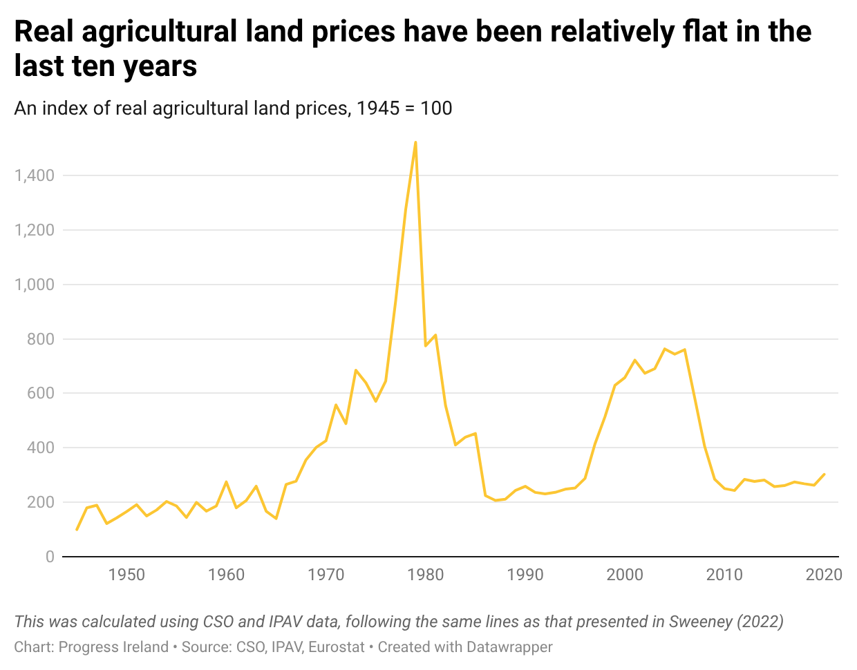 Large scale speculation would see agricultural land prices rise in tow. But in real terms, agricultural land prices have been fairly flat in the past decade or so. Notable periods of inflation are easy to identify from the graph. On the one hand, we have the period of speculation that resulted in The Committee on the Price of Building Land Report, also known as the Kenny Report in 1973. On the other hand, you can see the Celtic Tiger period. But there is little evidence in agricultural prices to suggest this kind of speculation is happening en masse, as noted by this TASC report on the issue.