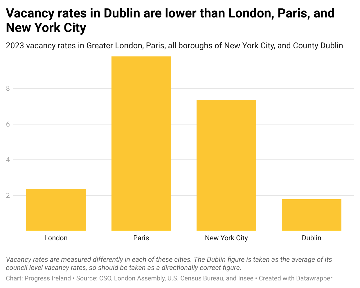 The levels of vacancy in Dublin are unusually low by international standards. New York, Paris, and London all have higher vacancy rates than Dublin.